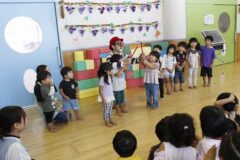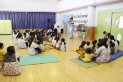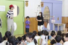 最後は見に来ていただいたおうちの方にも手伝ってもらい、皿回しリレーの成功です。