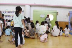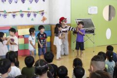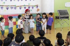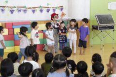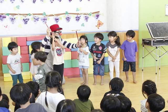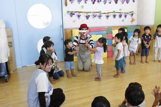 ピエロさん、参加型のパフォーマンスがとっても楽しく、出たい子に手をあげてもらい参加するスタイルです。