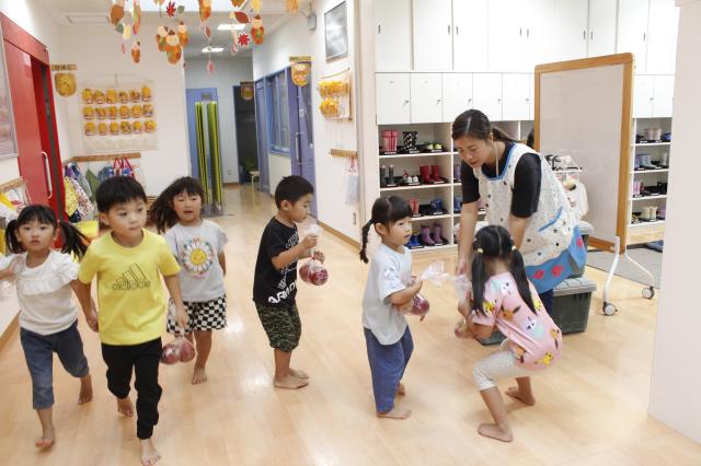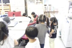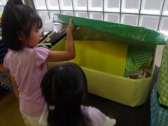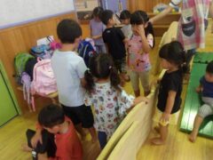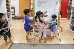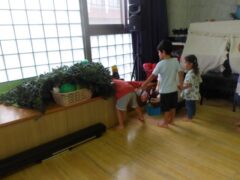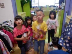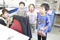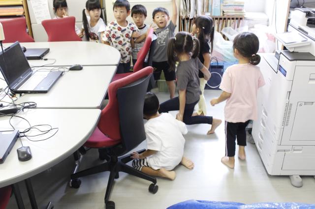 もしくは「どこに置いたかわからない」もしくは「転んでしまったらしい・・・」というような想定で子どもたちに伝え、園内を縦割りグループに分かれて