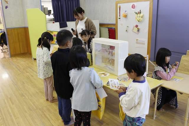 きりんさんはひよこさんのお世話、ひつじさんはりすさんのお世話をします。