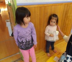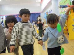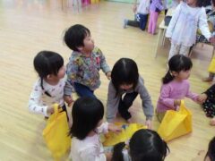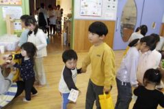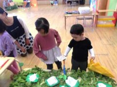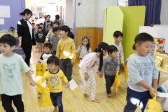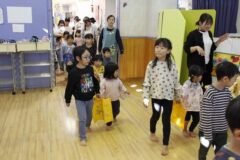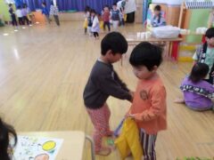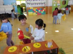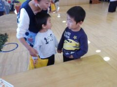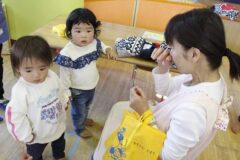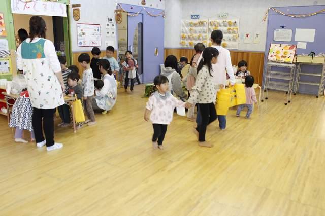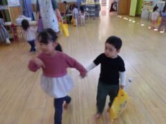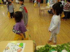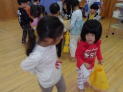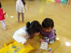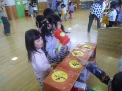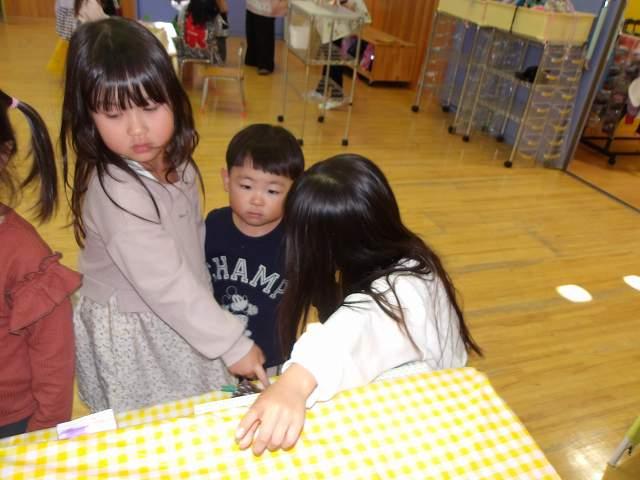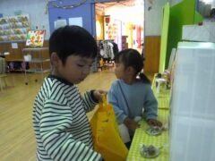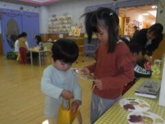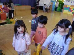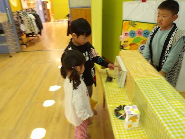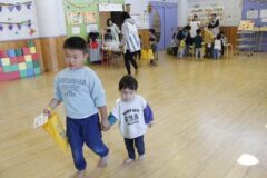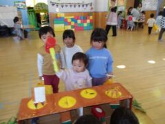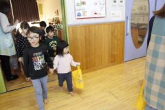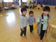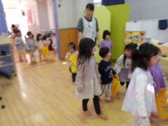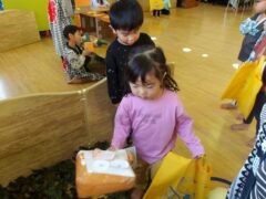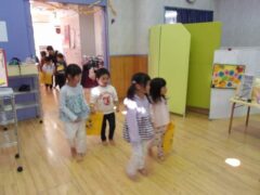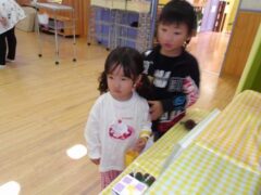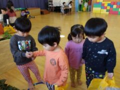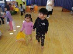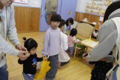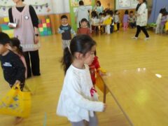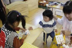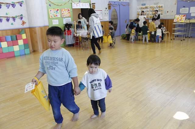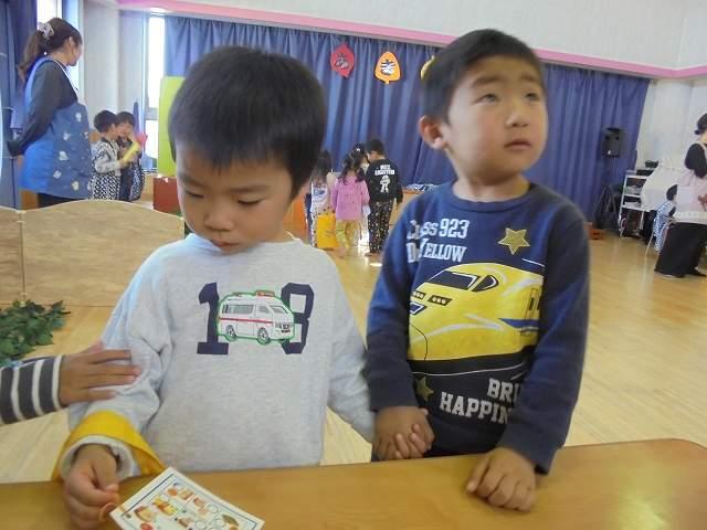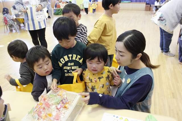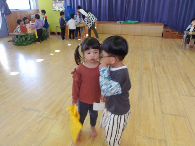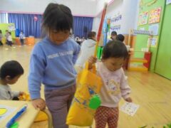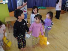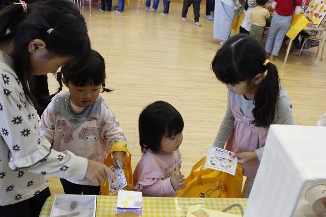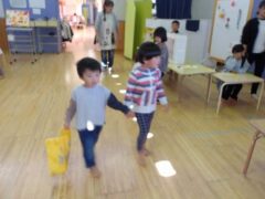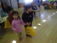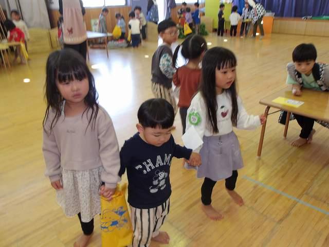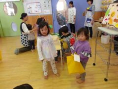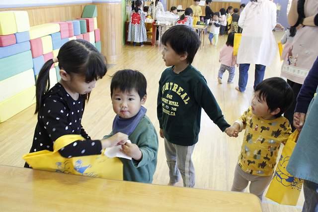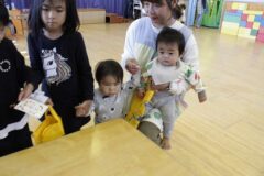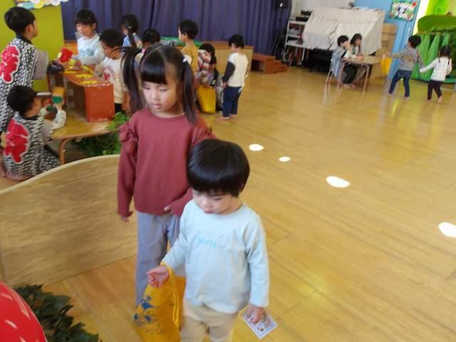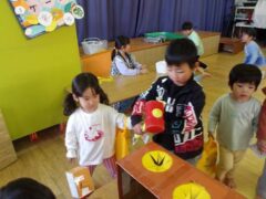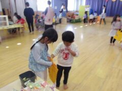 ひよこ・きりんさん。りす・ひつじさんがそれぞれペアになってお店をまわりました。たまご組は先生と回るお友だちやきりんさんに手伝ってもらうお友だちとそれぞれでした。