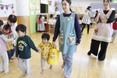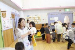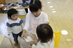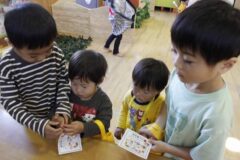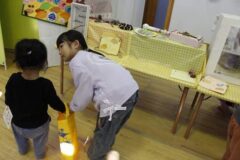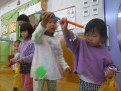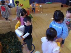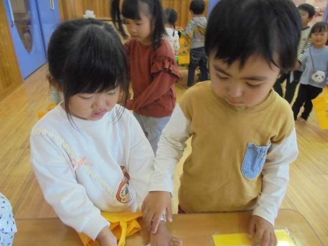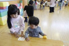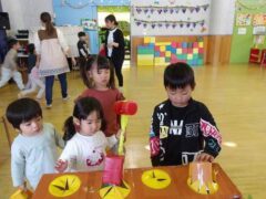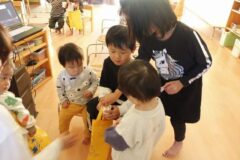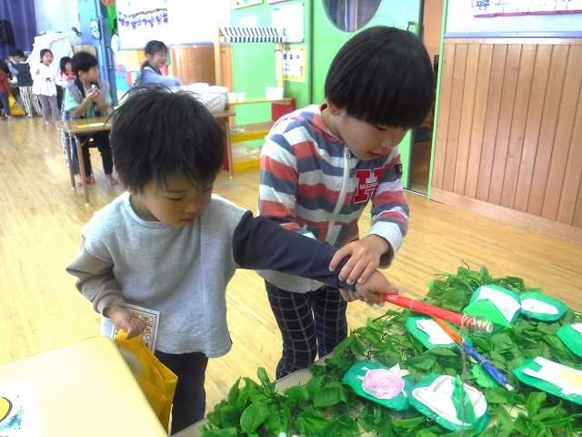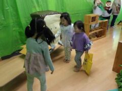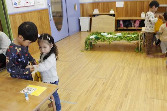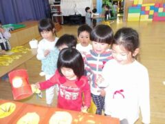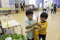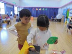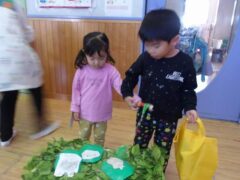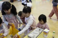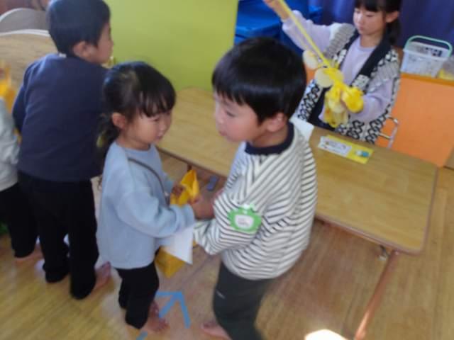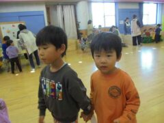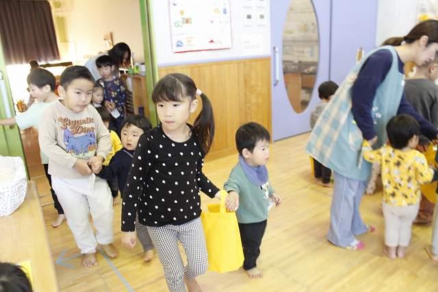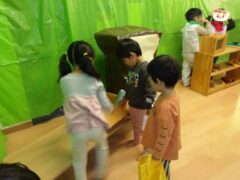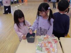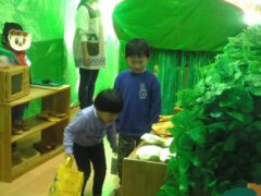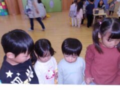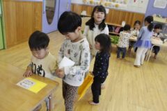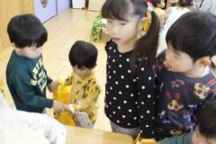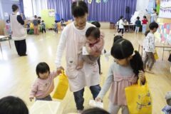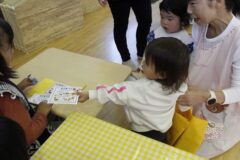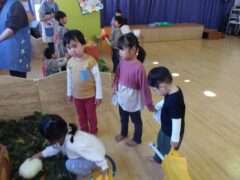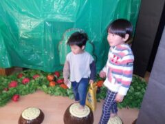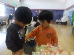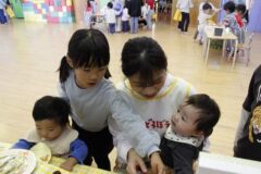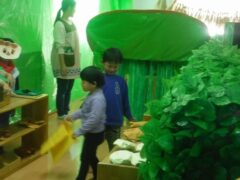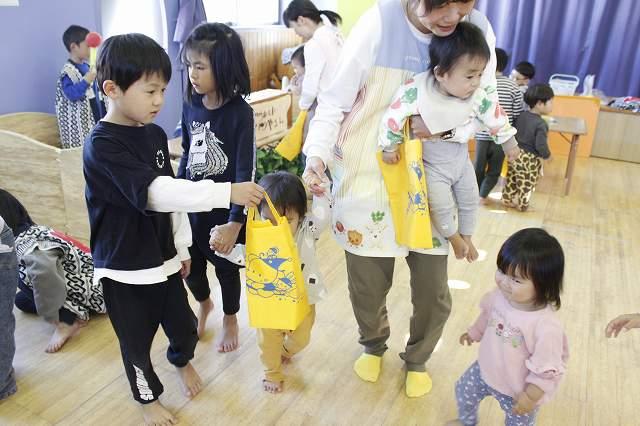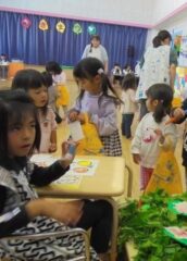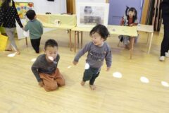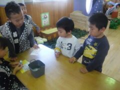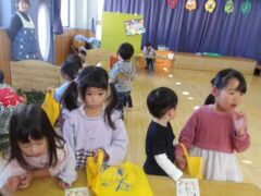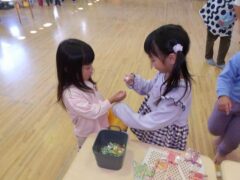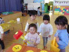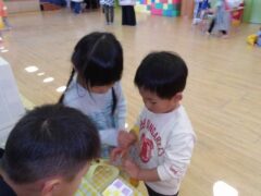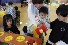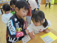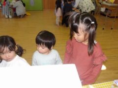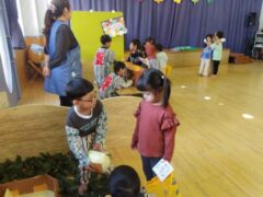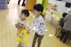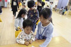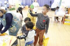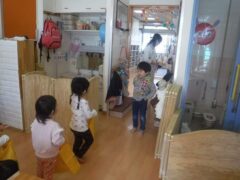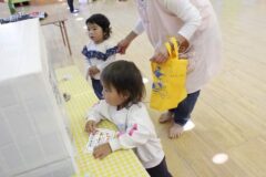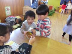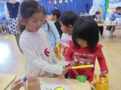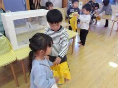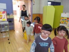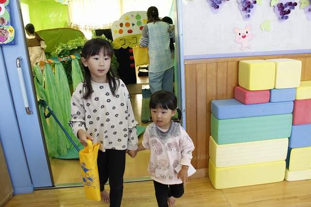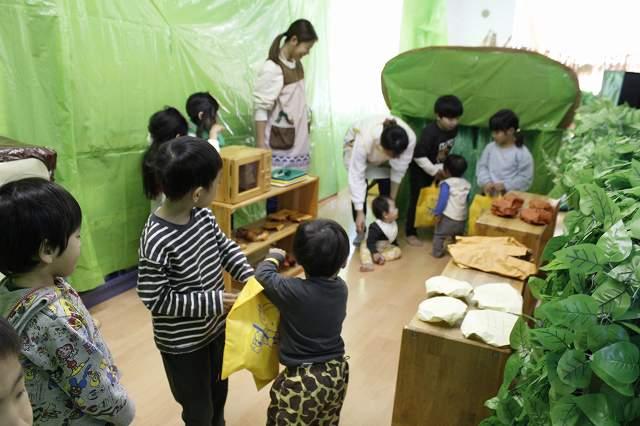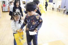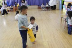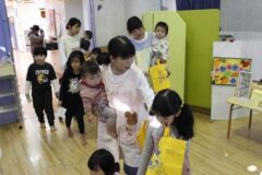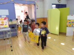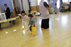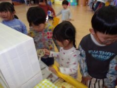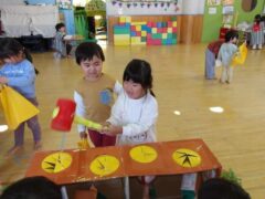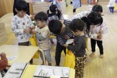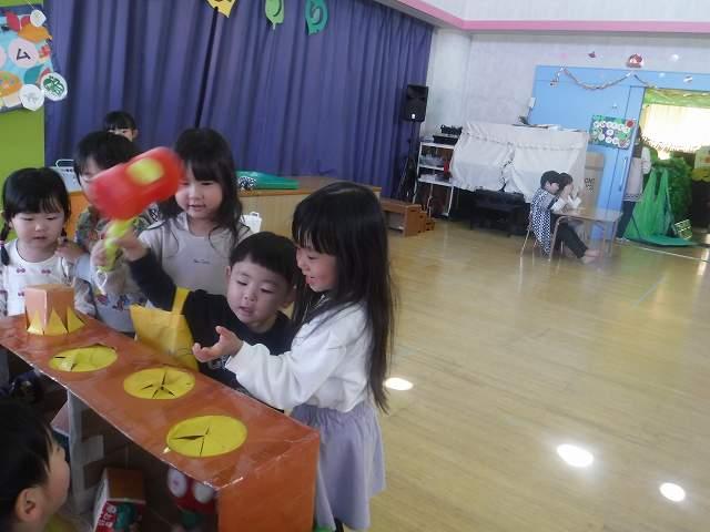 ひよこ・きりんさん。りす・ひつじさんがそれぞれペアになってお店をまわりました。たまご組は先生と回るお友だちやきりんさんに手伝ってもらうお友だちとそれぞれでした。
