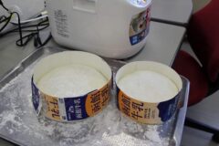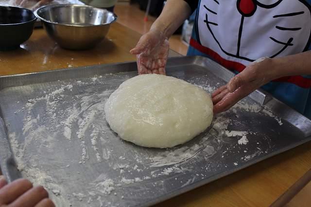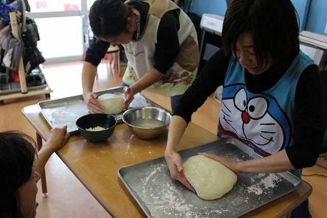 完成したお餅はえんちょうせんせいときりん組のHせんせいが鏡餅にしていきます。