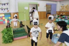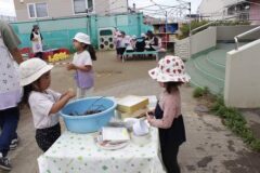 うさぎ・ひつじ・きりんさんは園庭で遊んでいました。