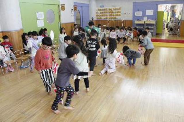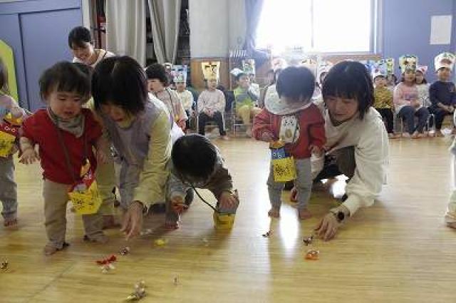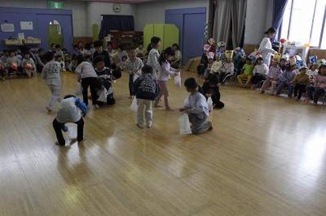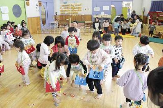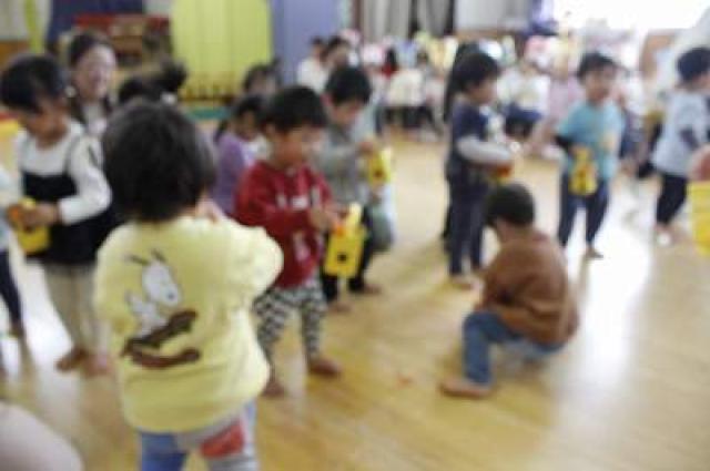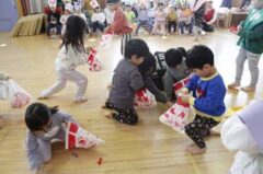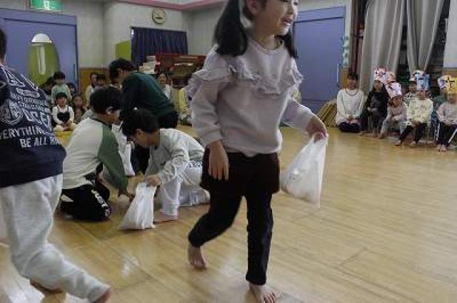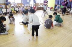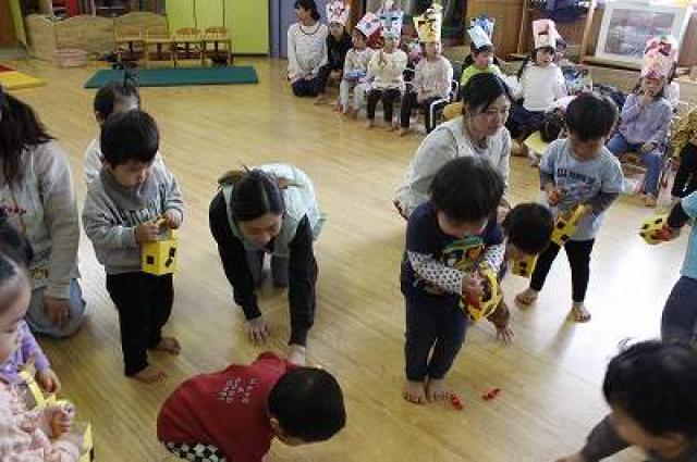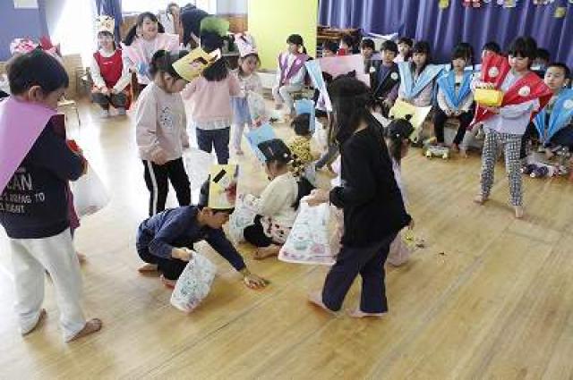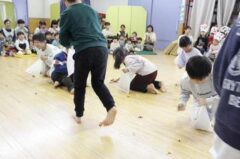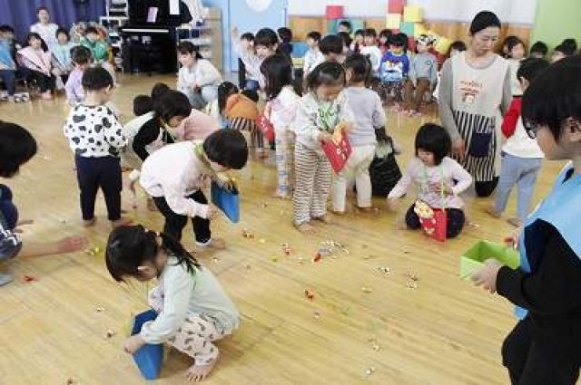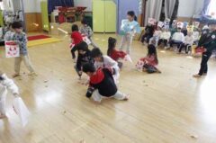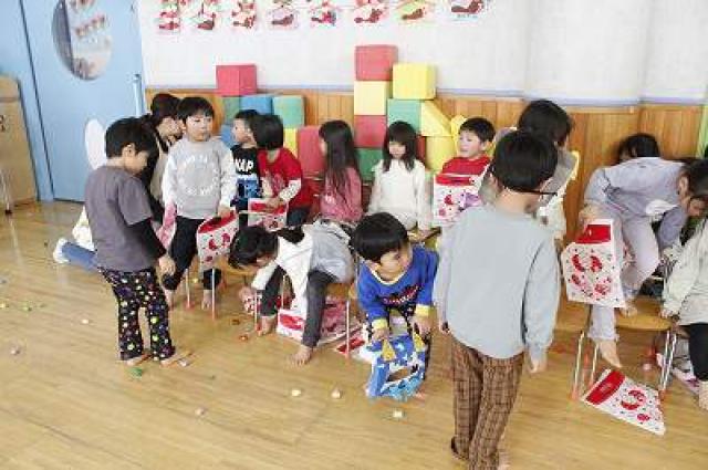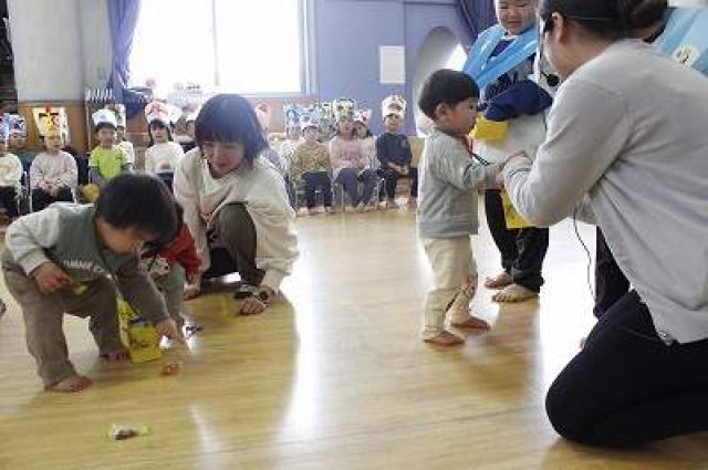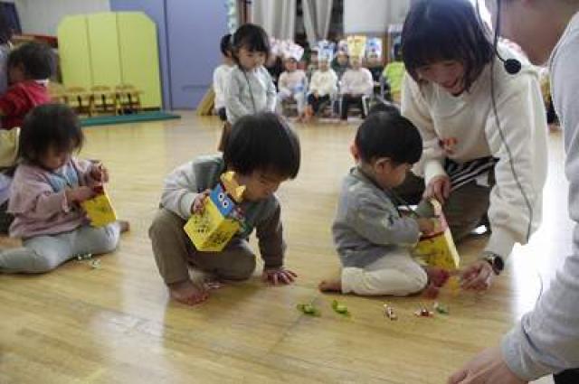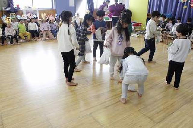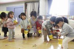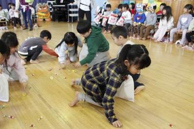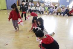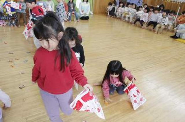 きりんさんは園長先生と、年女の先生が豆をまいてくれました。(きりんさんは二手に分かれて拾います)