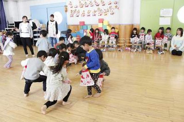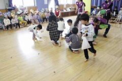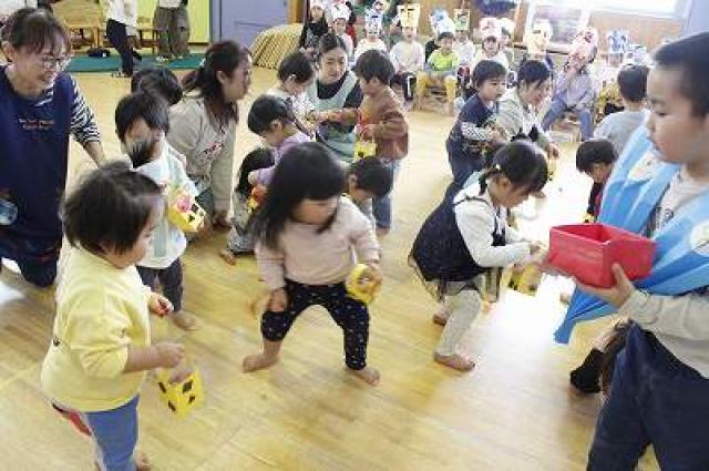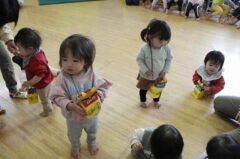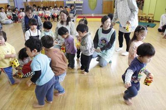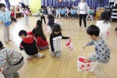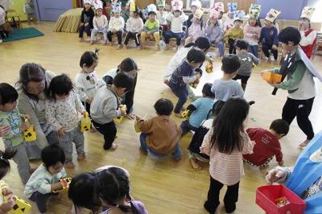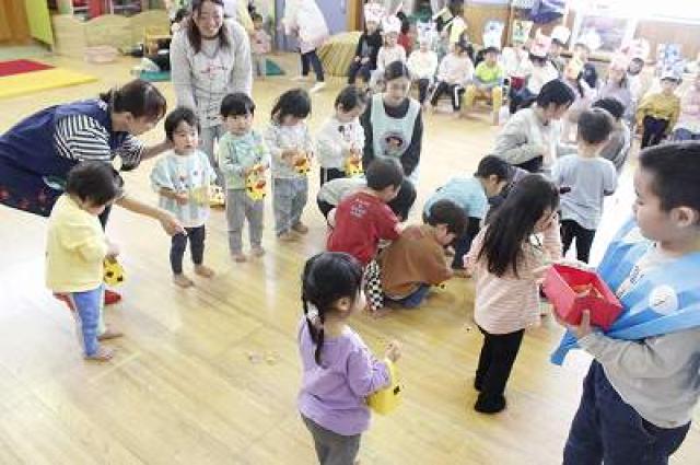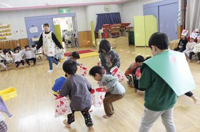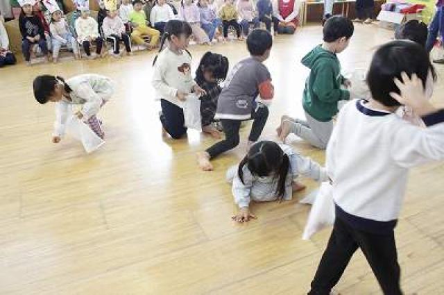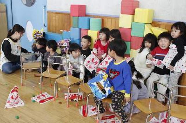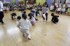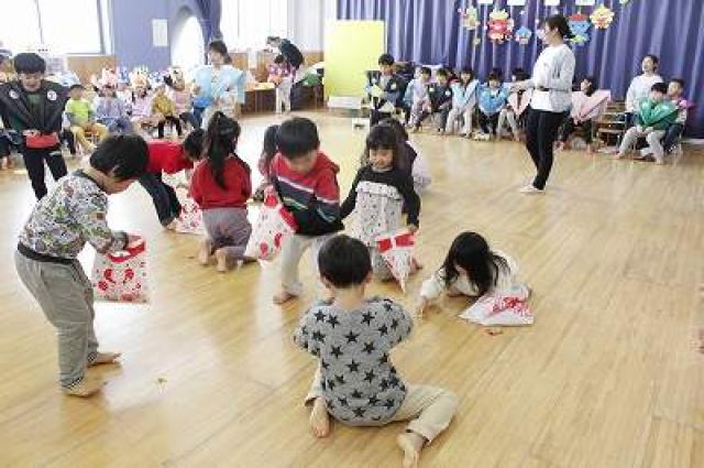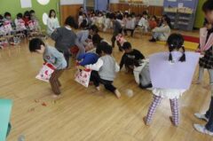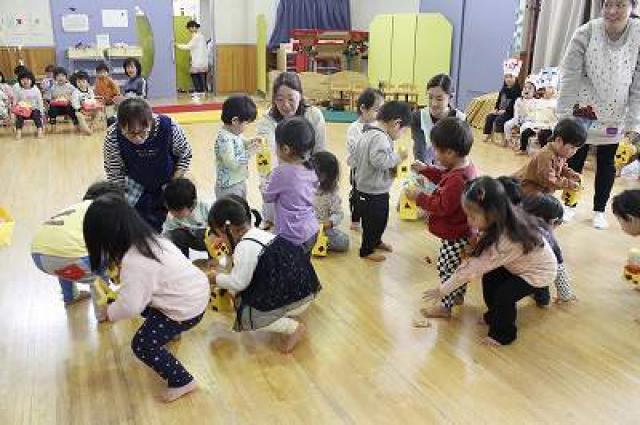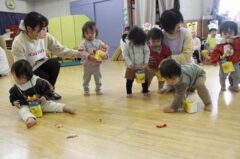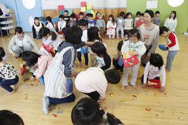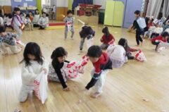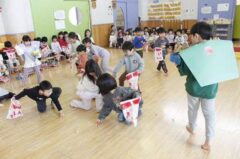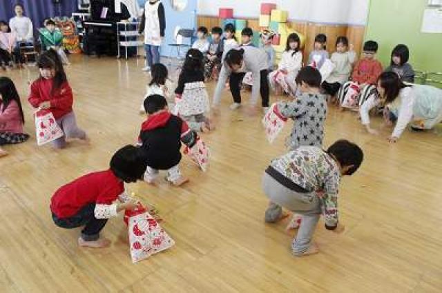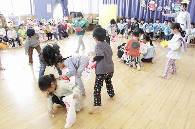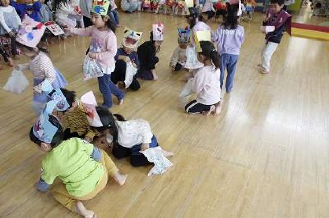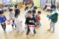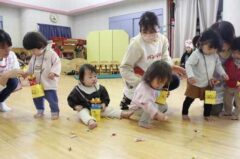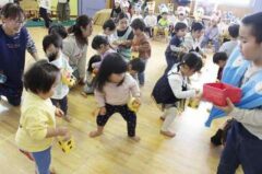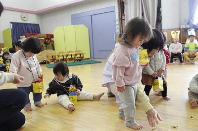 きりんさんは園長先生と、年女の先生が豆をまいてくれました。(きりんさんは二手に分かれて拾います)