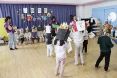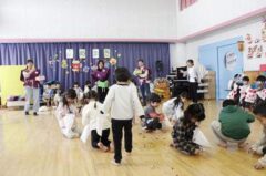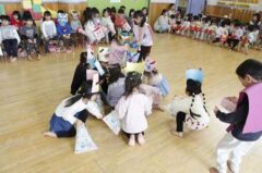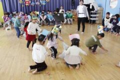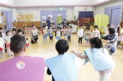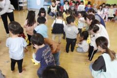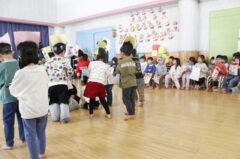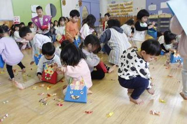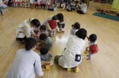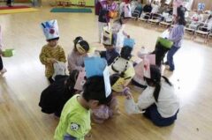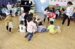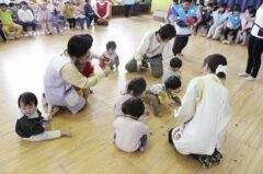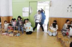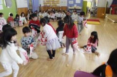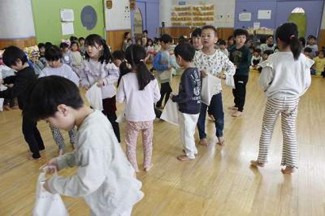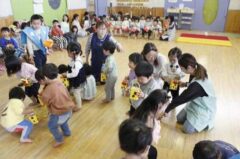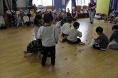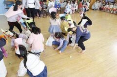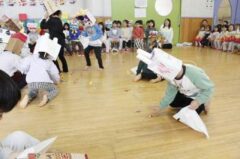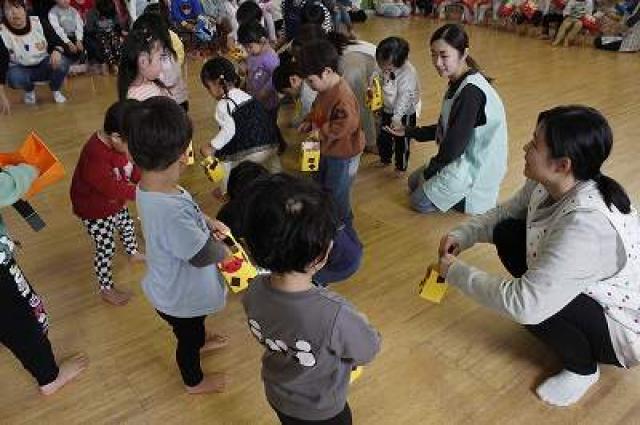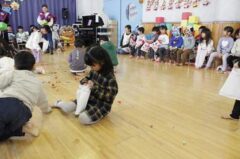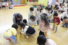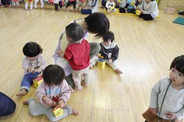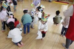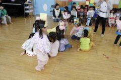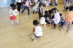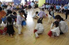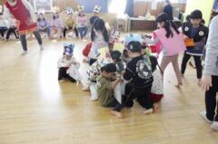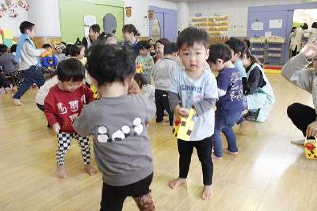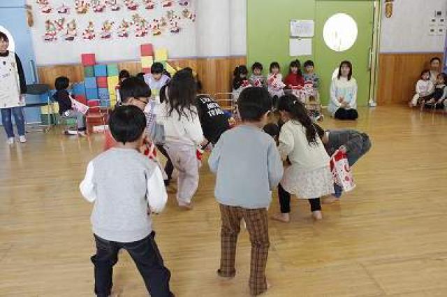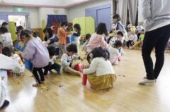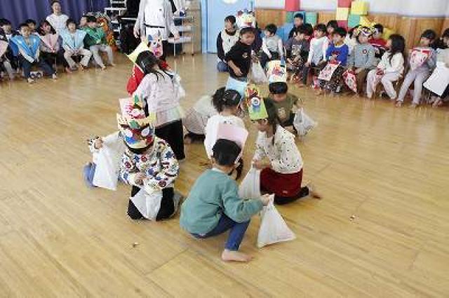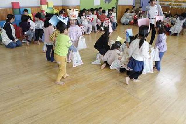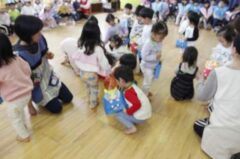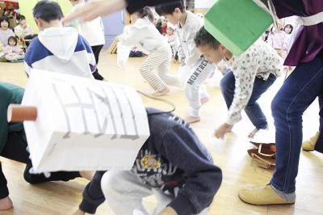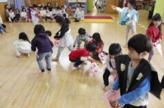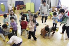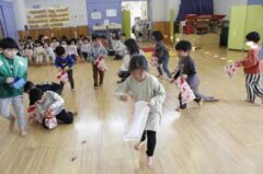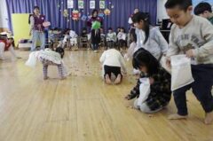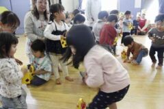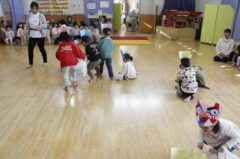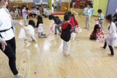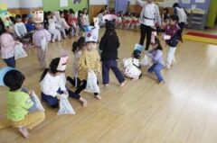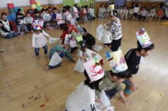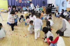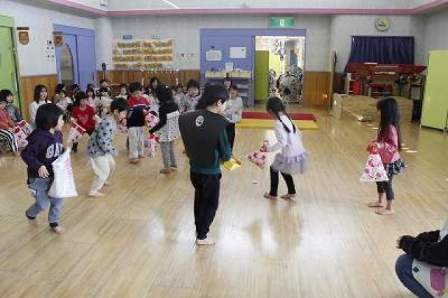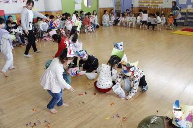 きりんさんは園長先生と、年女の先生が豆をまいてくれました。(きりんさんは二手に分かれて拾います)
