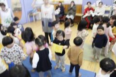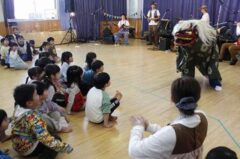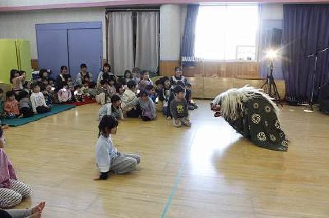 獅子の舞が怖くて全員が両端に逃げてしまった場面です。(勇敢な子、数名いた笑)
